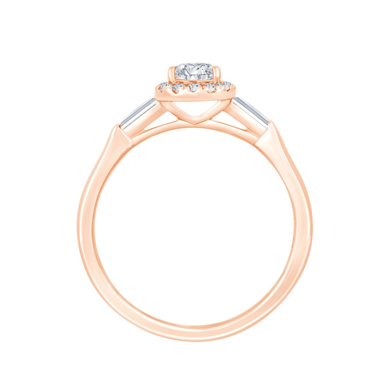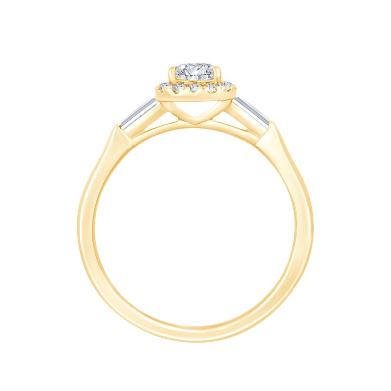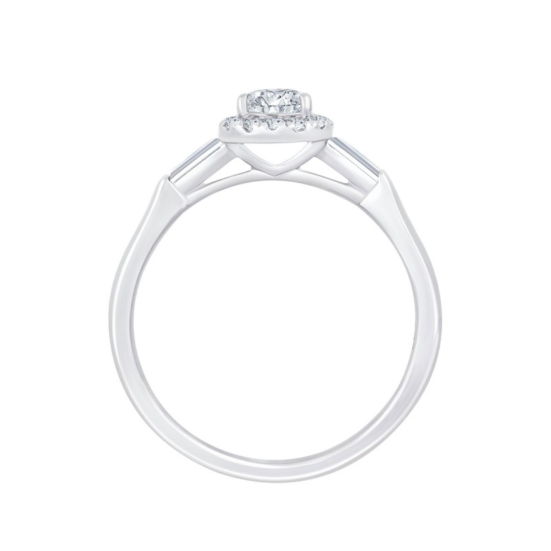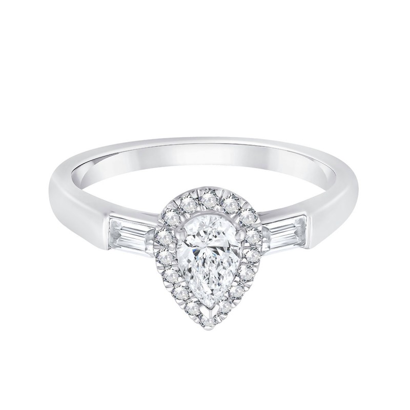 Les diamants taille baguette qui épaulent la pierre de centre de forme poire et son halo de diamants de synthèse donnent à cette précieuse bague de fiançailles un look rétro qui nous plaît beaucoup.