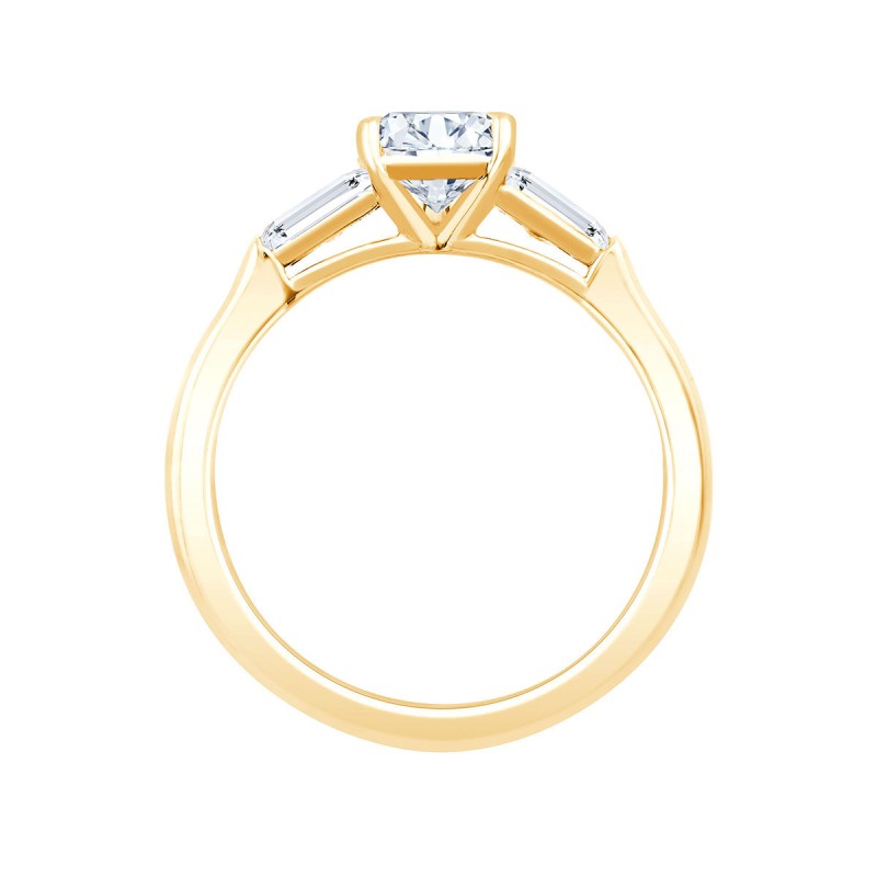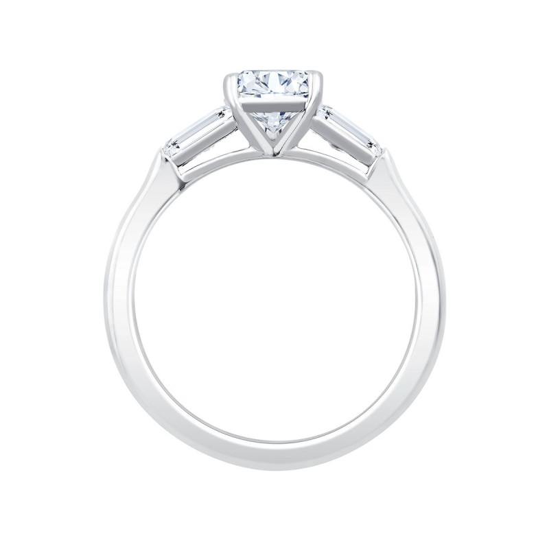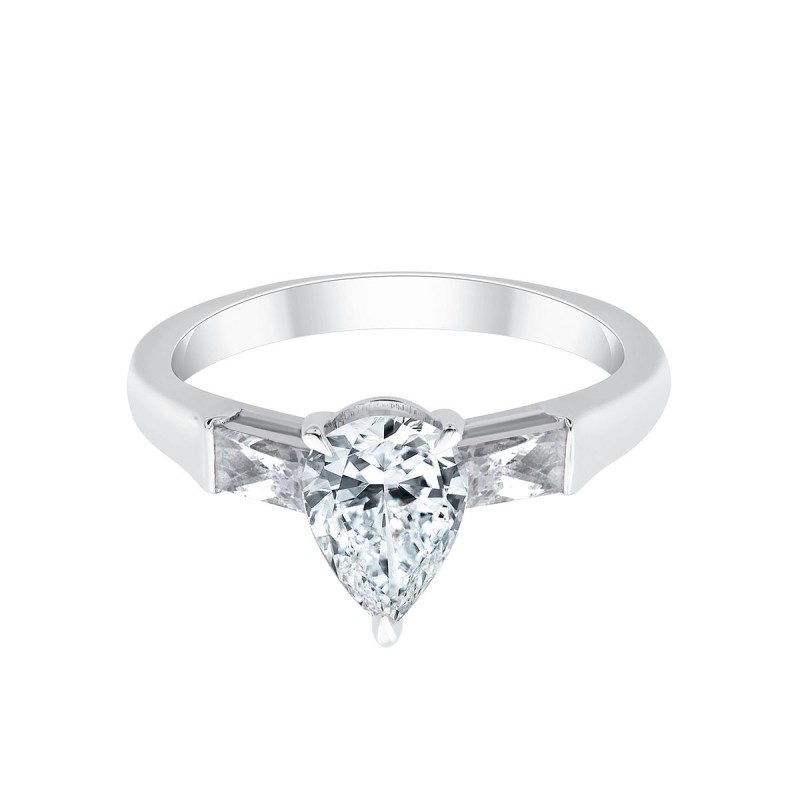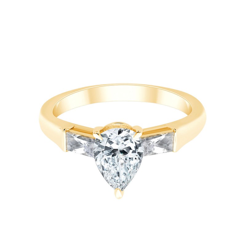 Les diamants taille baguette qui épaulent la pierre de centre de forme poire donnent à cette précieuse bague de fiançailles un look affirmé légèrement rétro qui nous plaît beaucoup.