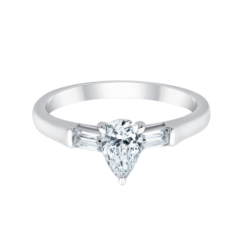 Les diamants taille baguette qui épaulent la pierre de centre de forme poire de 0.50 carat donnent à cette précieuse bague de fiançailles un look affirmé légèrement rétro qui nous plaît beaucoup.