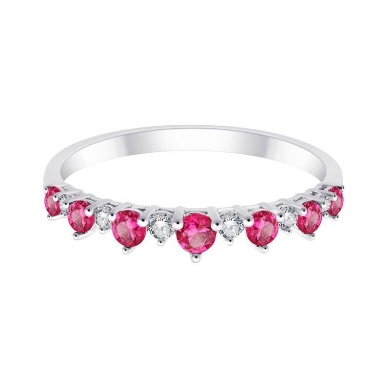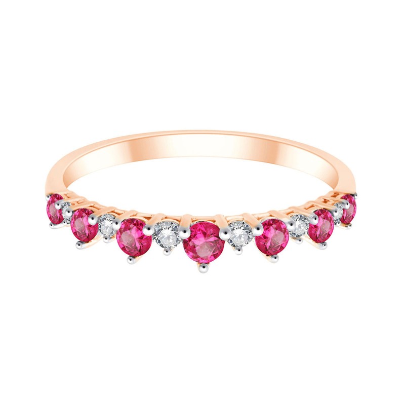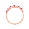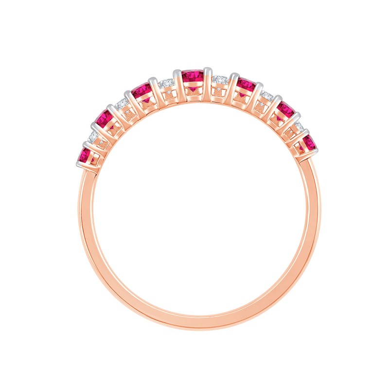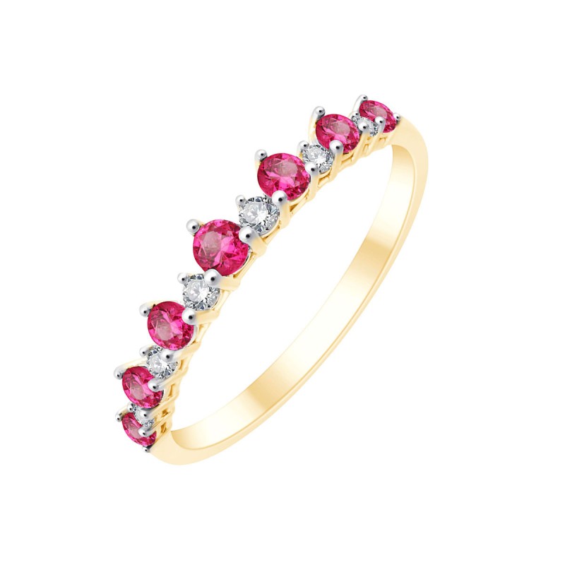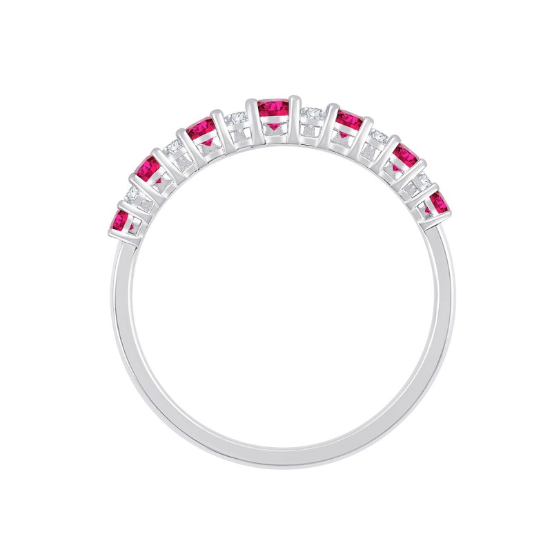 Diamants et rubis sont sertis en alternance sur un anneau en or 18 carats. Les griffes se font discrètes pour laisser la part belle au rythme créé par ce précieux duo. Les pierres sont libres, comme suspendues à un fil précieux.